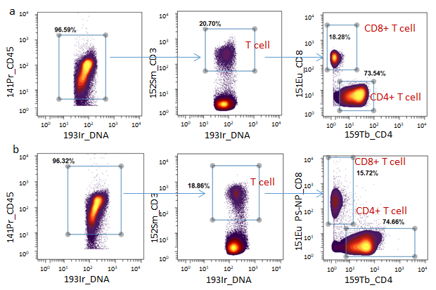 Dot plots of MNCs stained by a) 141Pr-MCP_CD45, 152Sm-MCP_CD3, 151Eu-MCP_CD8, 159Tb-MCP_CD4 and b) 141Pr-MCP_CD45, 152Sm-MCP_CD3, 151Eu-PS-NPs_CD8, 159Tb-MCP_CD4. (Image by SIBET)