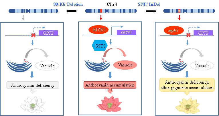 This study shows that an 80-kb deletion harboring NnMYB5 in the white petals of N. nucifera inactivates the expression of NnGST2, thereby blocking anthocyanin accumulation in the petals.