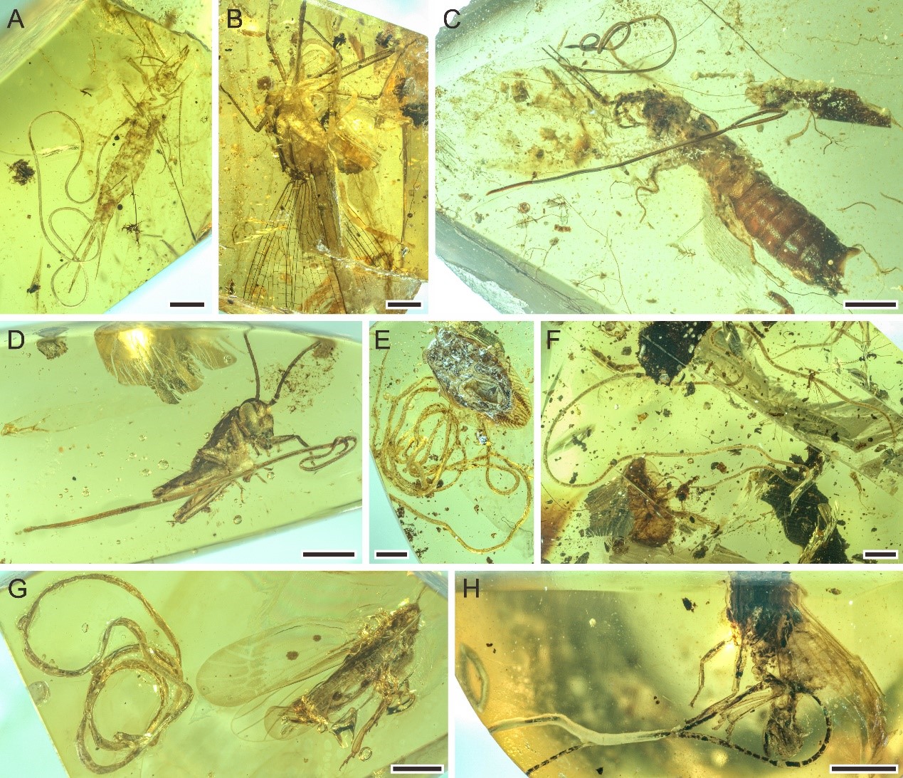Fig. 2 Mermithids and their insect hosts from mid-Cretaceous Kachin amber (about 100 million years ago) (Image by NIGPAS)