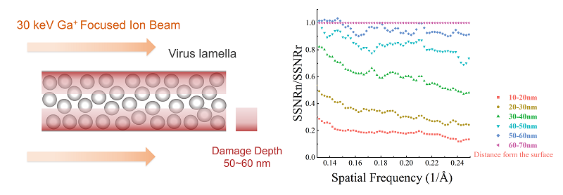 This work established a new method for quantifying the damage of FIB to cellular lamellae. The proteins in the cellular lamellae are grouped according to the distance from the surfaces by the electron tomography reconstruction. Based on the three-dimensional reconstruction of proteins in each group, researchers calculated the average signal-to-noise ratio (SNR) of protein in each group. The average SNRs reflected the data quality of protein in different groups and also represented the damage degree of the FIB to the protein at different distances from the surfaces quantificationally.