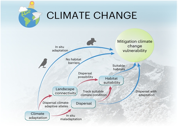 Climate adaptation, dispersal with adaptation, habitat suitability and landscape connectivity may act alone (blue arrows) or interact with other processes (red arrows) to mitigate risks caused by the climate change. (Image by GE Deyan and ZHAO Chao)