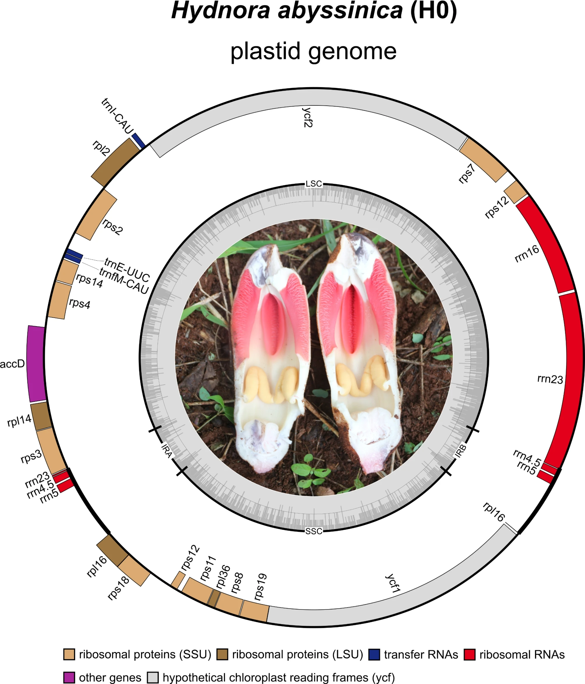 The plastid genome of Kenyan Hydnora abyssinica and its flowers. Genes inside the outer circle are transcribed clockwise, genes on the outside are transcribed counter clockwise. The inner grey circle visualizes the GC content across the plastome. (Image by WBG)