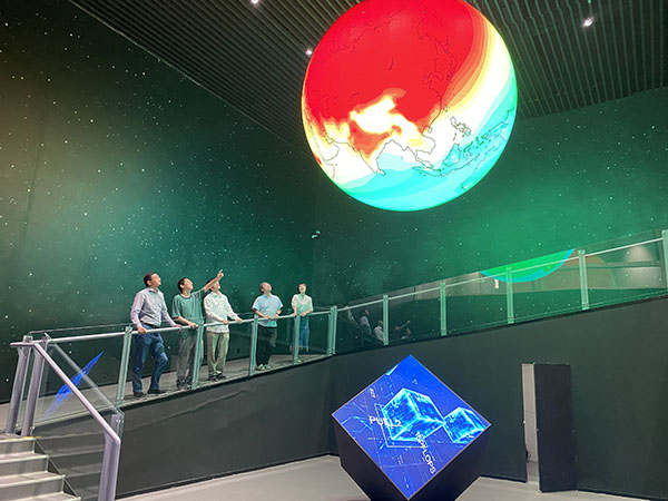 Fig. 2 The CAS-ESM team discussed the simulation results of fully coupled atmospheric CO2 seasonal variations while examining visualizations on the suspended dome screen at the Earth System Numerical Simulation Facility (EarthLab). (Image by LI Guoqiang)