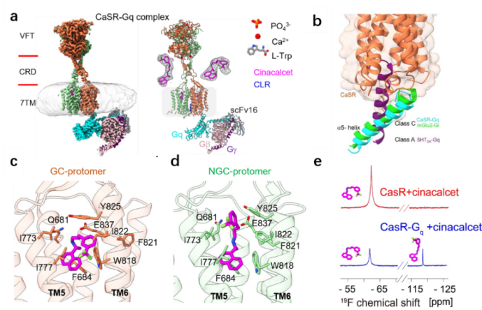 Researchers revealed two features of the CaSR-Gq complex structure, the first 3D structure of a C-family G protein-coupled receptor (GPCR) bound to Gq. First, different from the Gq protein binding mode of A- or B-family GPCRs, the α5 helix of the Gq protein was not inserted deep into the transmembrane helices on the intracellular side of the CaSR but rather bound to the receptor cytosolic side in a very shallow binding pocket. They also found that the difference in the binding pattern of CaSR-Gq and mGlu2-Gi, GABAB-Gi complexes reflected the specific binding interface between Gq and the receptor.