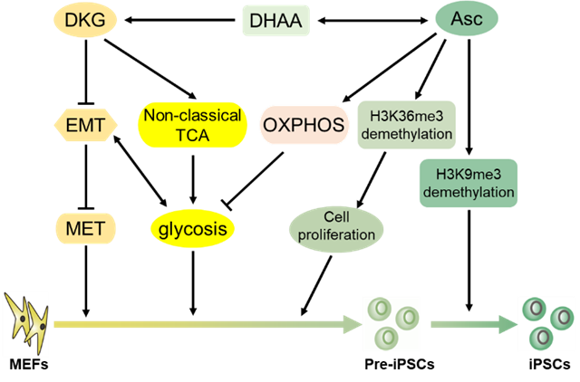 During somatic cell reprogramming, somatic cells were treated with Vc and its metabolites, including dehydroascorbic acid (DHAA) and DKG. It was found that Vc exhibits a dual capacity to promote reprogramming through both DKG-dependent and -independent pathways. On the one hand, Asc facilitated reprogramming by promoting cell proliferation and inducing the conversion from pre-induced pluripotent stem cells (pre-iPSCs) to iPSCs through DKG-independent pathways. On the other hand, Vc triggers MET and activates glycolysis through a DKG-dependent mechanism.