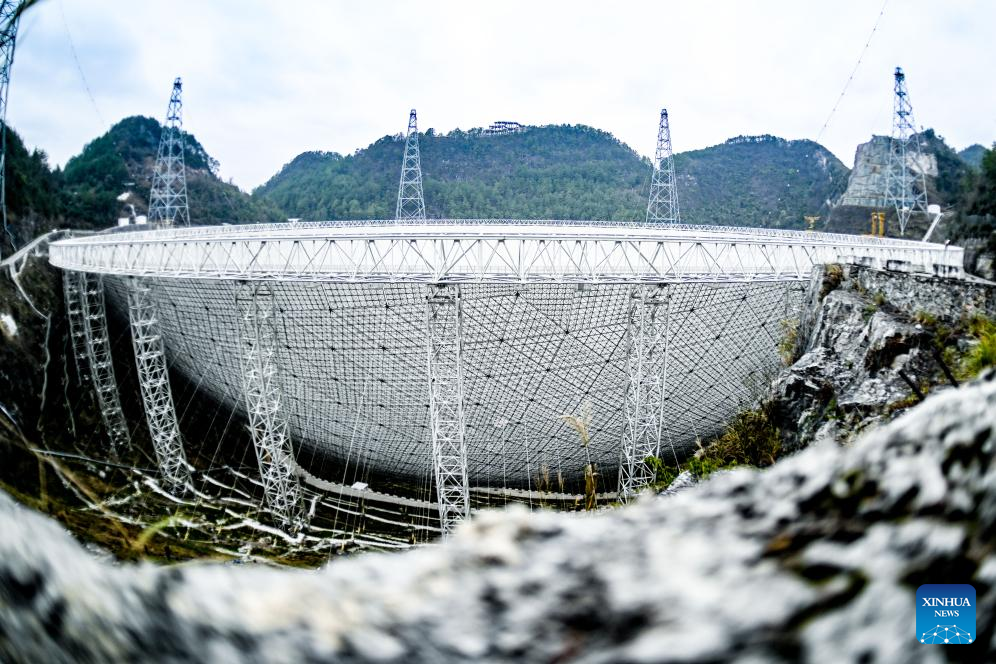 This photo taken on Feb. 26, 2024 shows China's Five-hundred-meter Aperture Spherical Radio Telescope (FAST) under maintenance in southwest China's Guizhou Province. China's Five-hundred-meter Aperture Spherical Radio Telescope (FAST), the world's largest single-dish radio telescope, has identified more than 900 new pulsars since its launch in 2016, its operator said Wednesday. (Xinhua/Ou Dongqu)