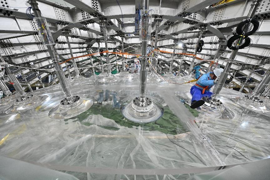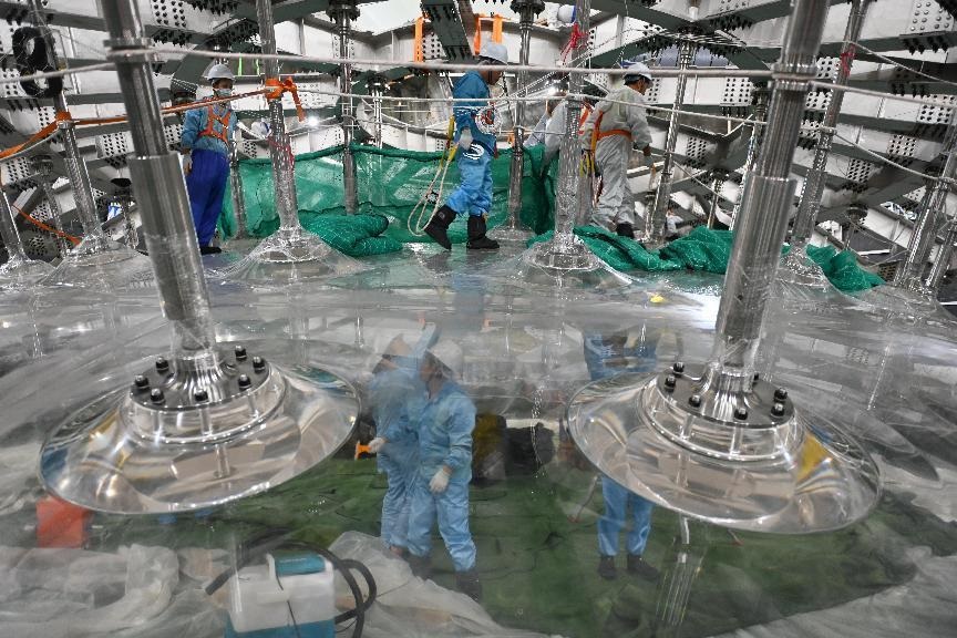 The facility consists of a stainless steel shell spanning 41 meters in diameter, an acrylic sphere measuring 35.4 meters in diameter, 20,000 metric tons of liquid scintillator and 45,000 photomultiplier tubes. (China Daily)