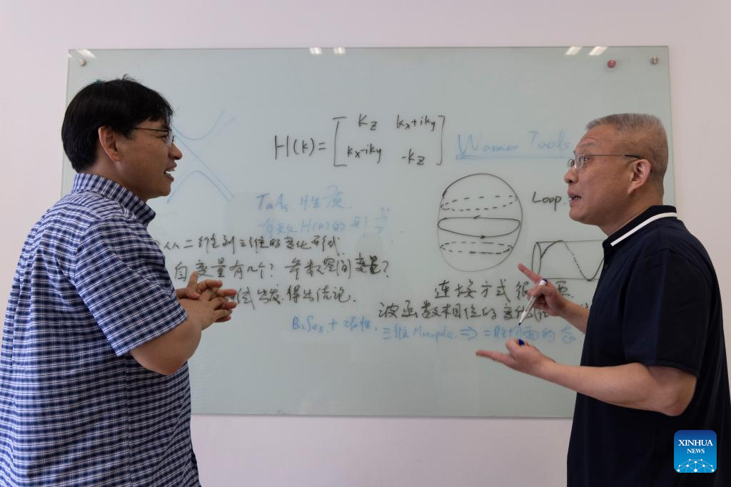 Fang Zhong (R) and his team member Weng Hongming talk on research progress at the Institute of Physics, Chinese Academy of Sciences in Beijing, capital of China, June 19, 2024. (Xinhua/Jin Liwang)