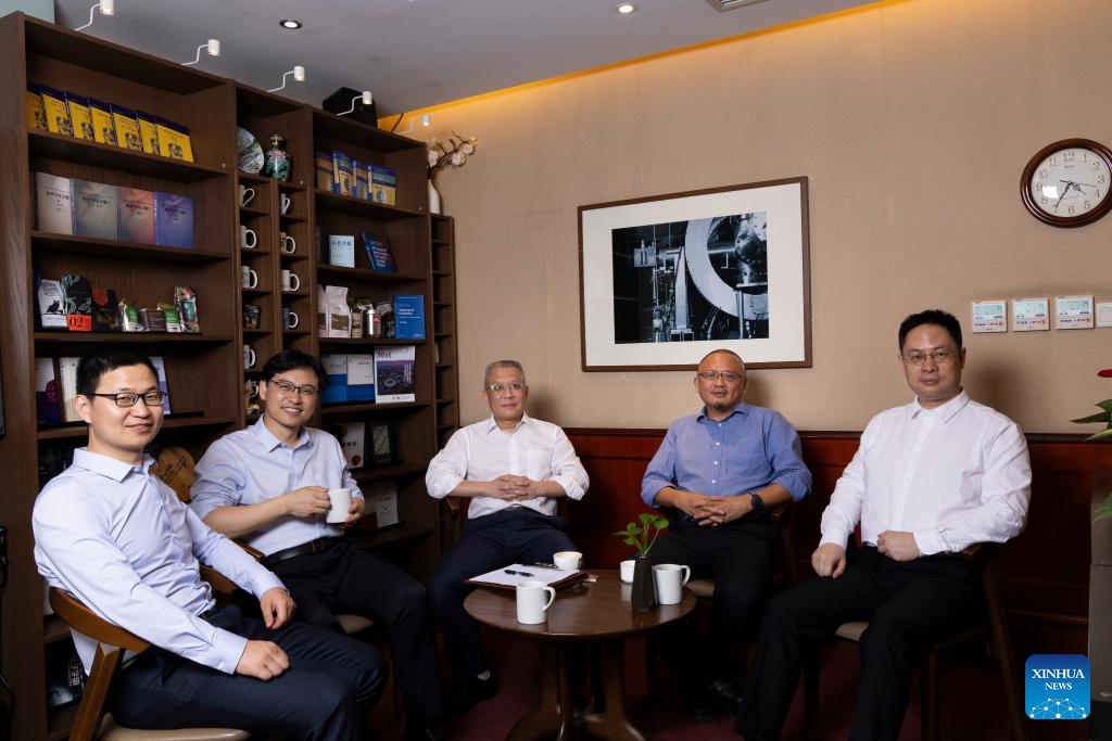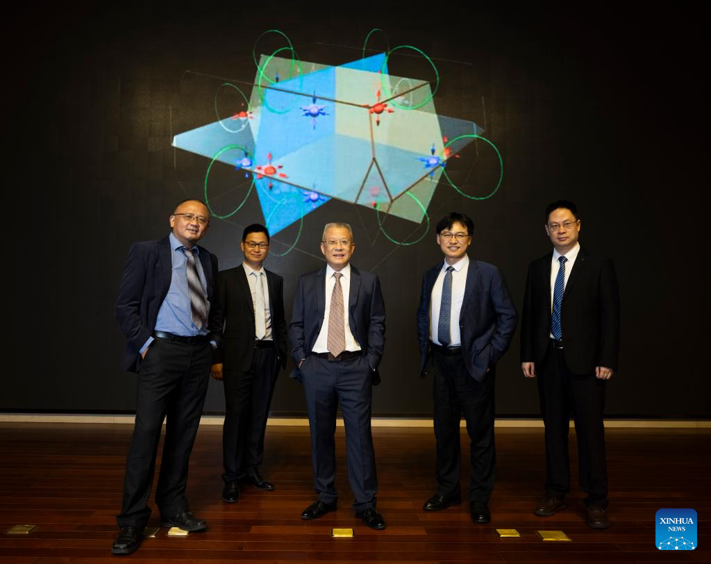 Fang Zhong (C) and his team members Wang Zhijun (1st L), Weng Hongming (2nd L), Dai Xi (2nd R), Yu Rui (1st R) pose for a group photo at the Institute of Physics, Chinese Academy of Sciences in Beijing, capital of China, June 22, 2024. (Xinhua/Jin Liwang)