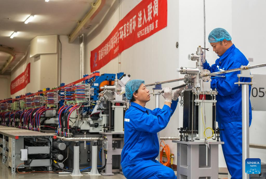 Staff members work at the High Energy Photon Source (HEPS) in Beijing, capital of China, June 30, 2024. Upon the completion of the vacuum circuit of its storage ring, the HEPS has entered the joint test stage on Monday. The HEPS is a major science infrastructure project built by the Institute of High Energy Physics under the Chinese Academy of Sciences. (Xinhua/Jin Liwang)