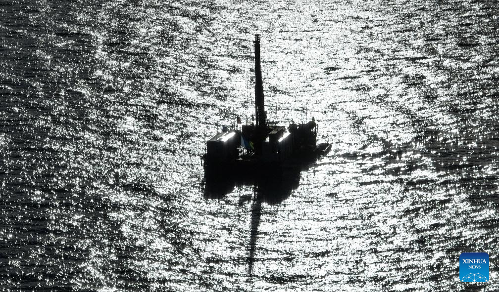An aerial drone photo taken on July 12, 2024 shows a drilling platform on Nam Co, in southwest China's Xizang Autonomous Region. (Xinhua/Jigme Dorje)