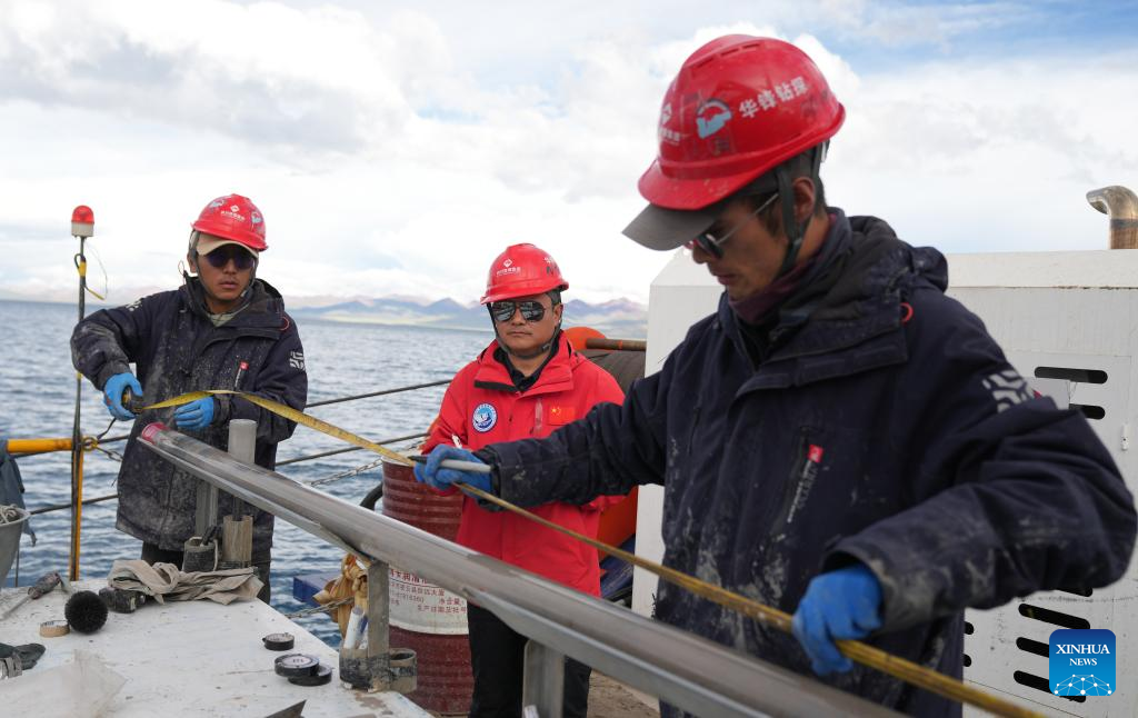 Technicians collect samples from the lake core of 402.2 meters on Nam Co, in southwest China's Xizang Autonomous Region, July 12, 2024. (Xinhua/Jigme Dorje)