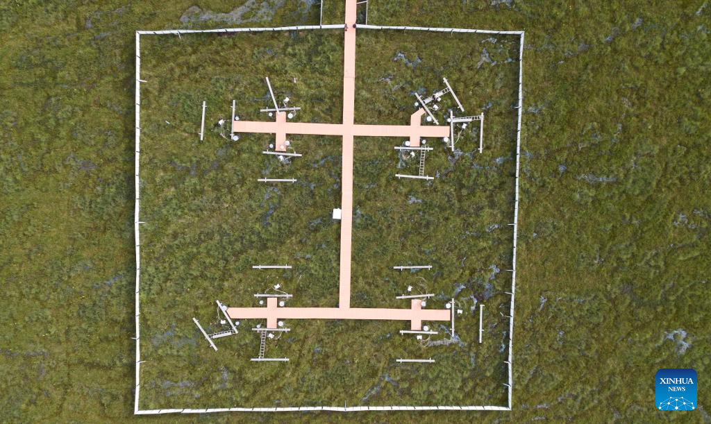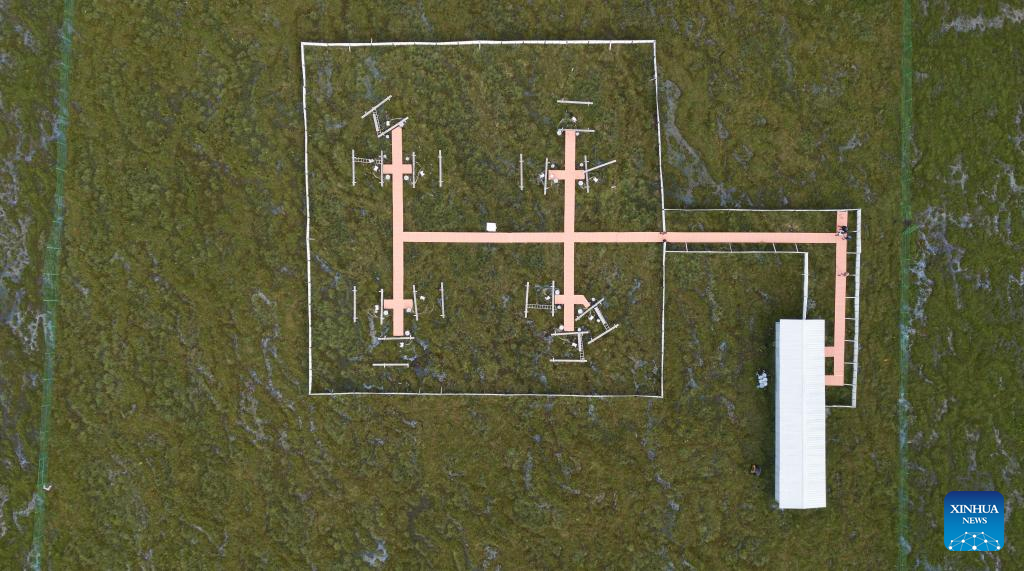 An aerial drone photo taken on July 25, 2024, shows researchers collecting samples at a test platform in Zoige wetland in the Aba Tibetan and Qiang Autonomous Prefecture, southwest China's Sichuan Province. The Zoige Wetland Ecology Research Station, established by the Chengdu Institute of Biology of the Chinese Academy of Sciences in the Aba Tibetan and Qiang Autonomous Prefecture in southwest China's Sichuan Province, went operational on Friday. The station is expected to provide scientific and technical support and policy recommendations for regional ecological protection and sustainable socio-economic development in southwest China, and also make scientific explorations for global wetland protection, according to Gao Yongheng, head of the research station. The Zoige plateau, one of the main distribution areas of high-altitude wetlands in China, serves as an important ecological barrier. With the backdrop of global climate change, the region is facing significant ecological challenges, including biodiversity loss and a weakened wetland ecosystem, scientists say. (Xinhua/Jin Liwang)