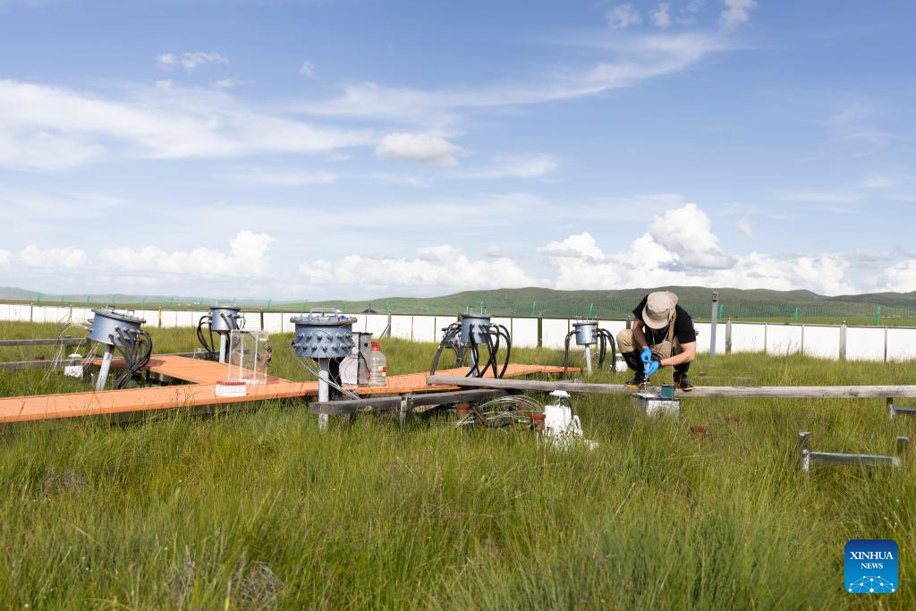 Researchers collect samples at a test platform in Zoige wetland in the Aba Tibetan and Qiang Autonomous Prefecture, southwest China's Sichuan Province, July 25, 2024. (Xinhua/Jin Liwang)