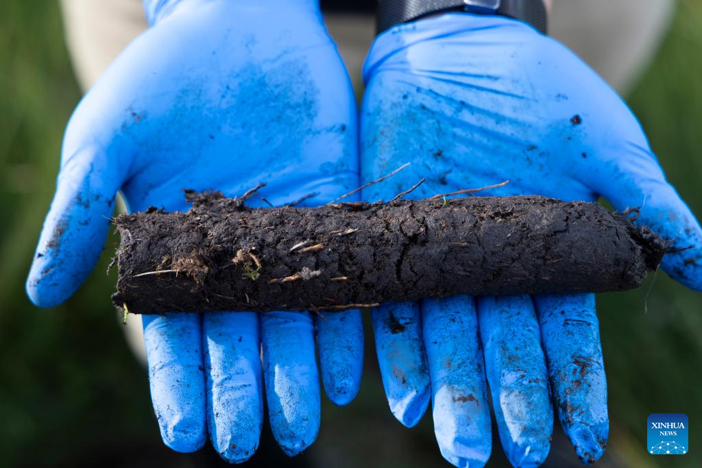 A researcher presents a peatland sample collected at a test platform in Zoige wetland in the Aba Tibetan and Qiang Autonomous Prefecture, southwest China's Sichuan Province, July 25, 2024. (Xinhua/Jin Liwang)