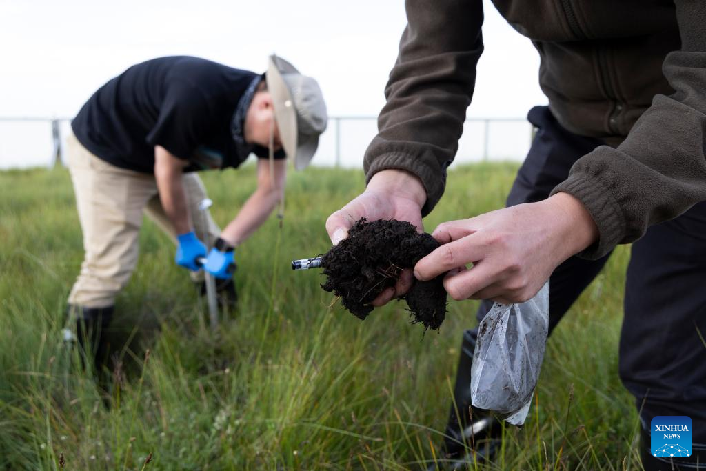 Researchers collect peatland samples at a test platform in Zoige wetland in the Aba Tibetan and Qiang Autonomous Prefecture, southwest China's Sichuan Province, July 25, 2024. (Xinhua/Jin Liwang)