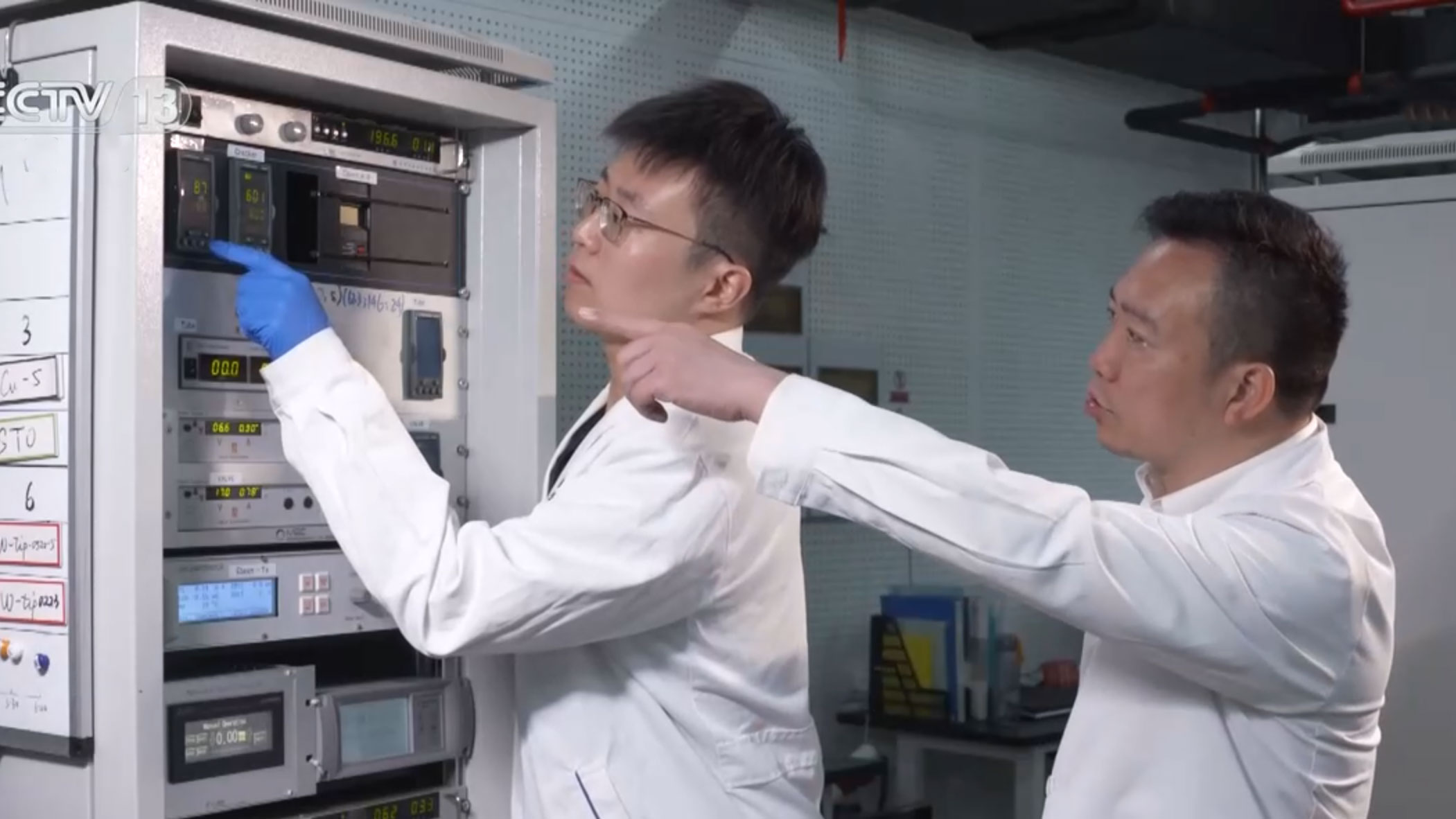 Tian Zi'ao (L) and Di Zengfeng (R), both researchers at the Shanghai Institute of Microsystem and Information Technology, Chinese Academy of Sciences, check up on scientific devices. /China Media Group