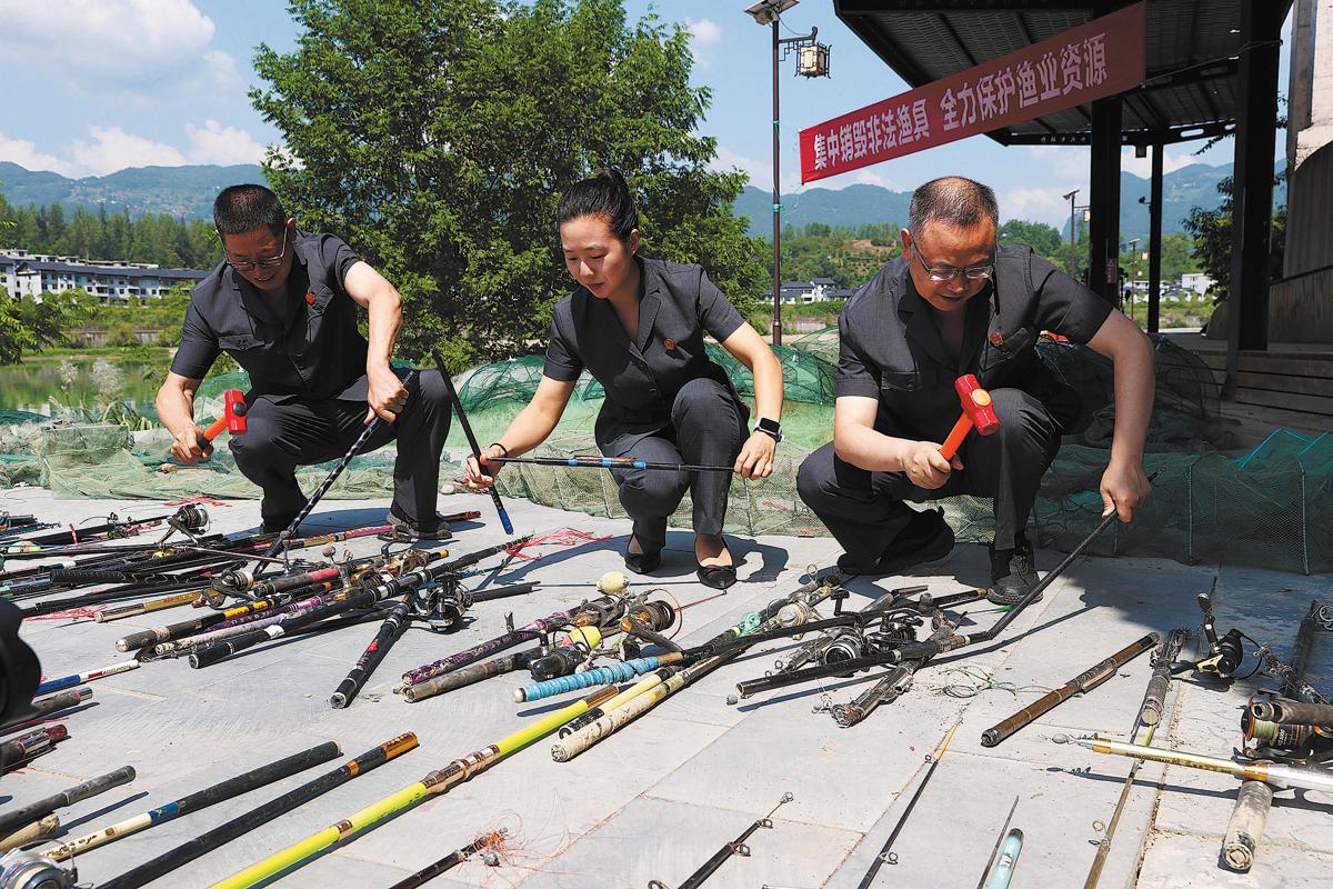 Banned fishing rods and equipment are destroyed by law enforcement officers near the Apeng River, a secondary tributary of the Yangtze River, in Chongqing earlier this month. YANG MIN/FOR CHINA DAILY