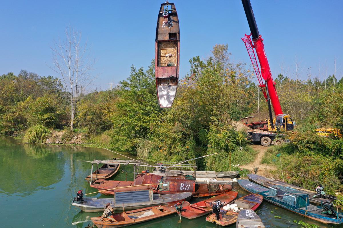A fishing boat is hoisted out of the Ganjiang River to be scrapped and recycled in Taihe, Jiangxi province, in November. CHINA DAILY