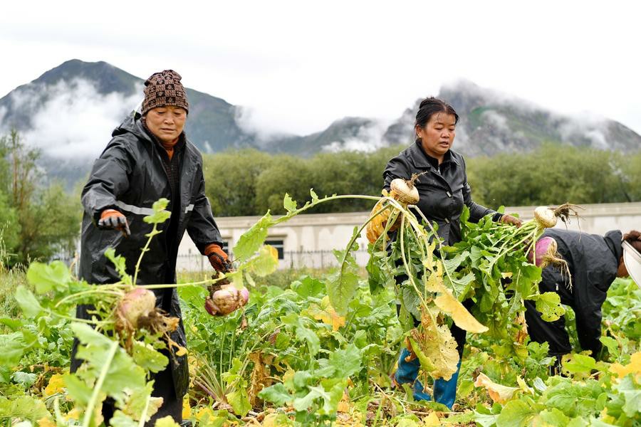 Farmers harvest turnips in Quxu County of Lhasa, capital of southwest China's Xizang Autonomous Region, Aug. 14, 2024. (Xinhua/Zhang Rufeng)