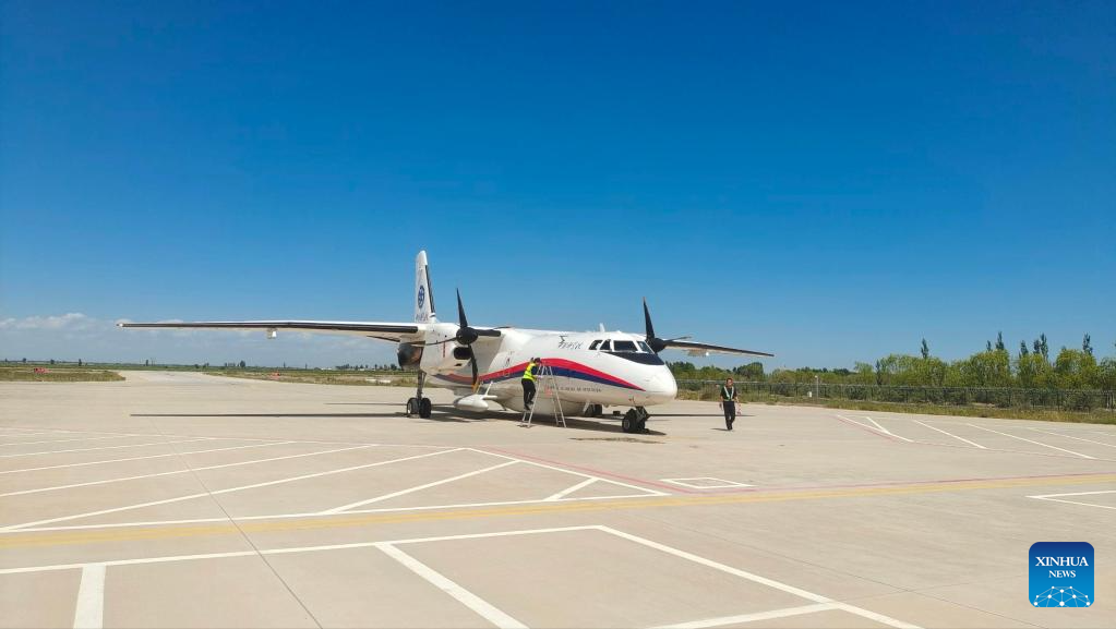 A China's homegrown MA60 remote sensing aircraft is pictured during a scientific operation in Bayannur City, north China's Inner Mongolia Autonomous Region, Aug. 23, 2024. (The Aerospace Information Research Institute under the Chinese Academy of Sciences/Handout via Xinhua)