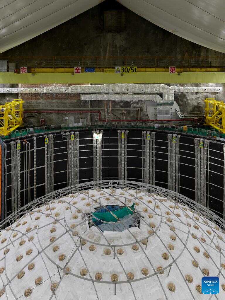 This photo shows the central detector of the Jiangmen Underground Neutrino Observatory (JUNO) under construction in Jiangmen, south China's Guangdong Province, Oct. 9, 2024. China has constructed the world's largest transparent spherical detector 700 meters underground to capture elusive neutrinos, often dubbed "ghost particles," to unravel the secrets of the infinitesimally small and the infinitely vast in the universe. (Xinhua/Jin Liwang)