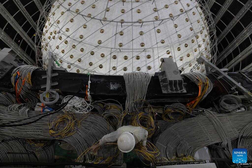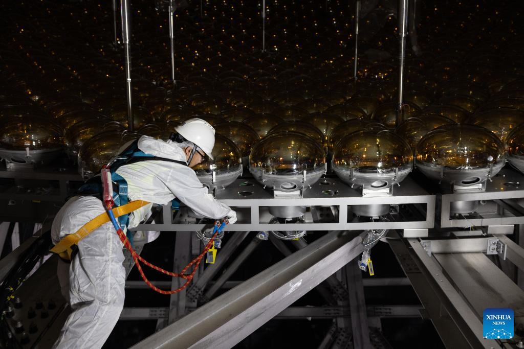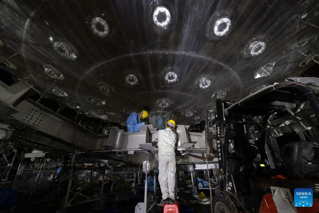 Staff members install photo-multiplier tubes of the central detector of the Jiangmen Underground Neutrino Observatory (JUNO) in Jiangmen, south China's Guangdong Province, Oct. 10, 2024. China has constructed the world's largest transparent spherical detector 700 meters underground to capture elusive neutrinos, often dubbed "ghost particles," to unravel the secrets of the infinitesimally small and the infinitely vast in the universe. (Xinhua/Jin Liwang)