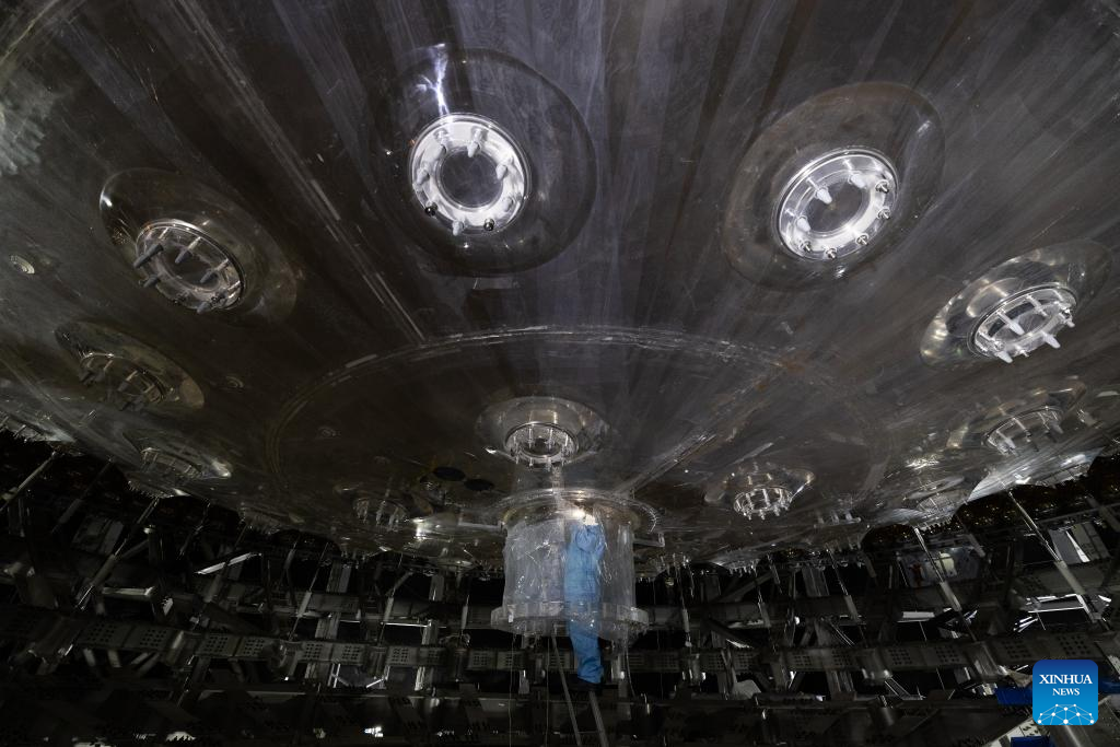 A staff member works beside the water tank of the central detector of the Jiangmen Underground Neutrino Observatory (JUNO) in Jiangmen, south China's Guangdong Province, Oct. 9, 2024. China has constructed the world's largest transparent spherical detector 700 meters underground to capture elusive neutrinos, often dubbed "ghost particles," to unravel the secrets of the infinitesimally small and the infinitely vast in the universe. (Xinhua/Jin Liwang)