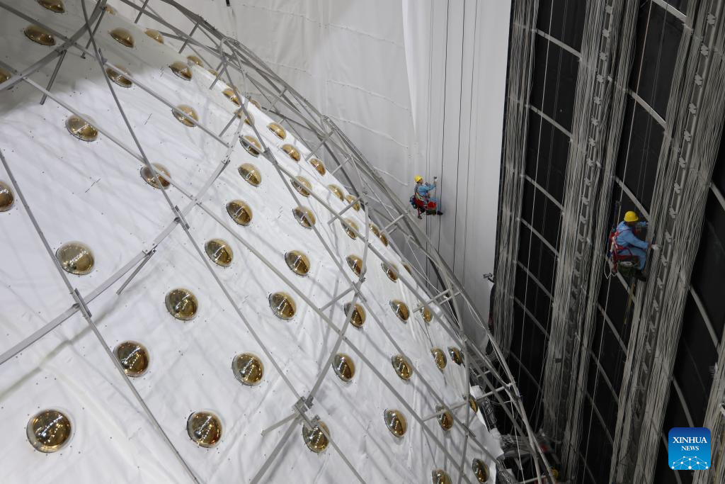 Staff members check the installation of the central detector of the Jiangmen Underground Neutrino Observatory (JUNO) in Jiangmen, south China's Guangdong Province, Nov. 22, 2024. The main part of the central detector has been constructed recently. As one of the world's most powerful experiments to uncover neutrino mystery, JUNO is expected to operate for at least 30 years. (Xinhua/Jin Liwang)