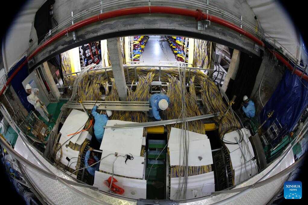 Staff members work at the construction site of the Jiangmen Underground Neutrino Observatory (JUNO) in Jiangmen, south China's Guangdong Province, Nov. 23, 2024. The main part of the central detector has been constructed recently. As one of the world's most powerful experiments to uncover neutrino mystery, JUNO is expected to operate for at least 30 years. (Xinhua/Jin Liwang)