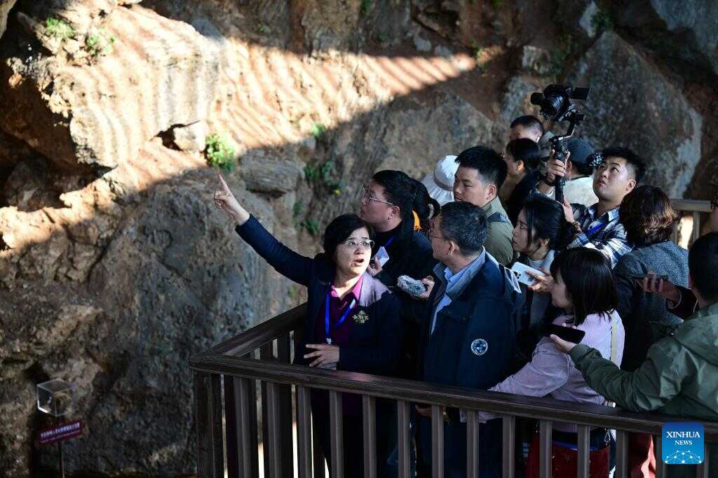 Wu Xiujie (1st L, front), a researcher at the Institute of Vertebrate Paleontology and Paleoanthropology of the Chinese Academy of Sciences, introduces Hualongdong site to visitors at the site in Dongzhi County of Chizhou City, east China's Anhui Province, Dec. 6, 2024. (Xinhua/Zhou Mu)