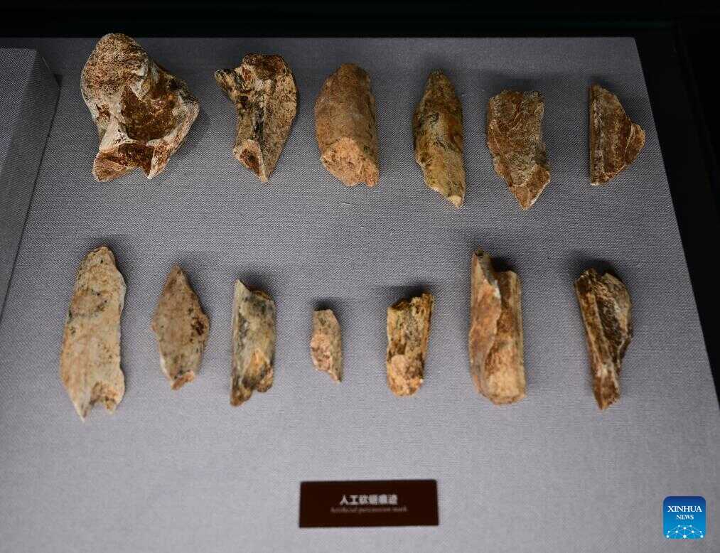 This photo taken on Dec. 6, 2024 shows bone fragments with evidence of artificial cutting and chopping displayed at the exhibition hall of Hualongdong site in Dongzhi County of Chizhou City, east China's Anhui Province. (Xinhua/Zhou Mu)