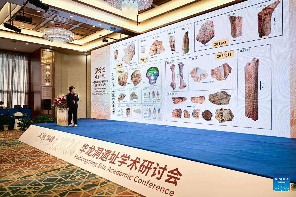 Wu Xiujie, a researcher at the Institute of Vertebrate Paleontology and Paleoanthropology of the Chinese Academy of Sciences, introduces the latest discoveries and studies concerning the Hualongdong ancient human site during the Hualongdong site academic conference in Dongzhi County of Chizhou City, east China's Anhui Province, Dec. 6, 2024. (Xinhua/Zhou Mu)