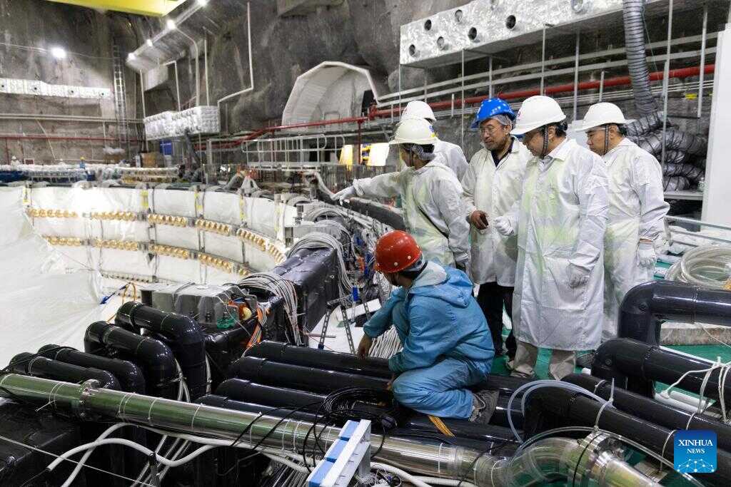 Researchers observe the status of the water tank after the liquid filling process started at the Jiangmen Underground Neutrino Observatory (JUNO) in Jiangmen, south China's Guangdong Province, Dec. 18, 2024. (Xinhua/Jin Liwang)