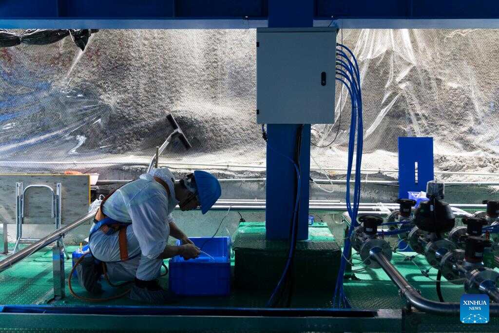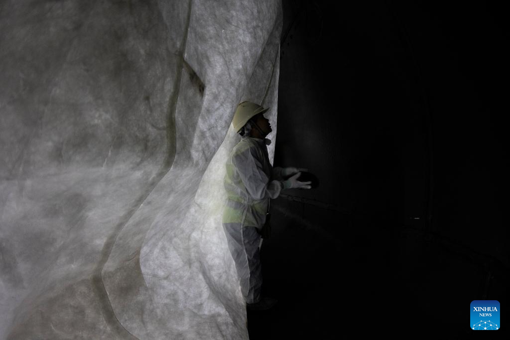 Ma Xiaoyan, chief engineer of the Jiangmen Underground Neutrino Observatory (JUNO), checks the bottom of a water tank of the JUNO in Jiangmen, south China's Guangdong Province, Dec. 16, 2024. (Xinhua/Jin Liwang)