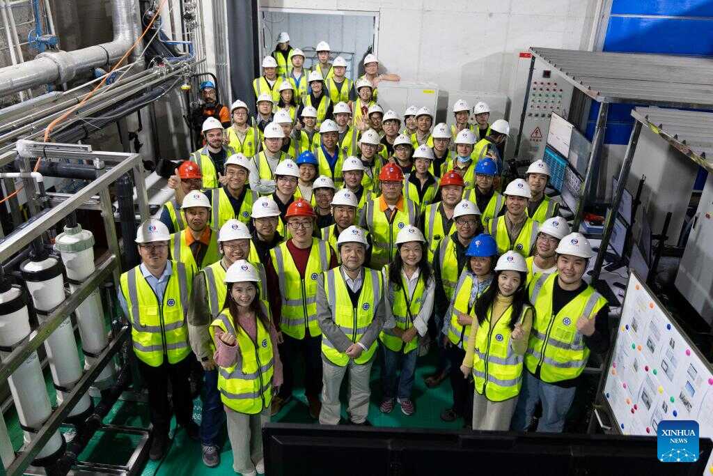 Researchers pose for a group photo to mark the start of liquid filling at the Jiangmen Underground Neutrino Observatory (JUNO) in Jiangmen, south China's Guangdong Province, Dec. 18, 2024. (Xinhua/Jin Liwang)