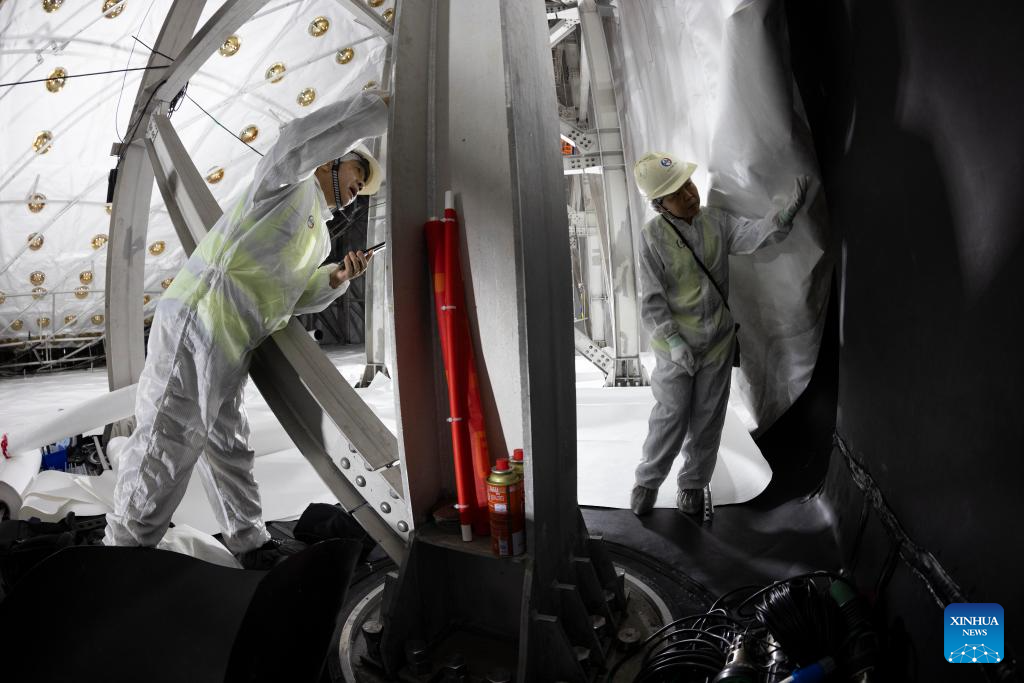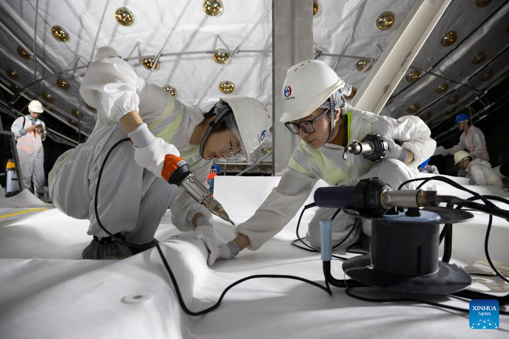 Staff members seal the bottom of a water tank with Tyvek material at the construction site of the Jiangmen Underground Neutrino Observatory (JUNO) in Jiangmen, south China's Guangdong Province, Dec. 16, 2024. (Xinhua/Jin Liwang)