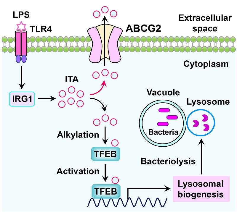 Mechanistic studies revealed that ABCG2-mediated extracellular transport of itaconate can downregulate the intracellular concentration of itaconate, limit itaconate-mediated activation of TFEB, reduce lysosomal biogenesis, and subsequently inhibit the antibacterial innate immune capacity of macrophages.