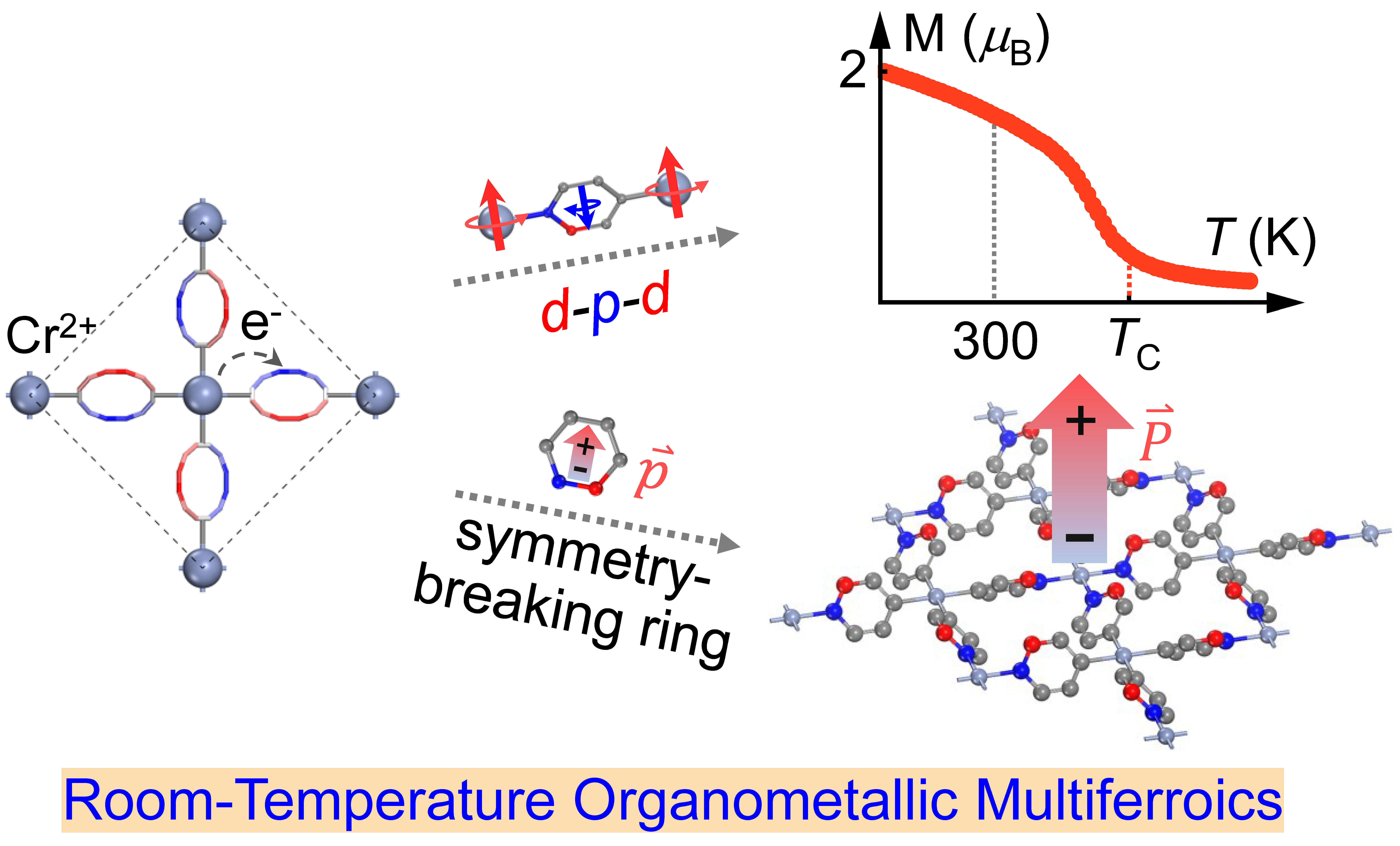 Using this method, they investigated 128 different 2D MOFs and discovered three unique multiferroic materials: Cr(1,2-oxazine)2, Cr(1,2,4-triazine)2, and Cr(1,2,3,4-trazine)2. All of these materials exhibit both ferrimagnetism and ferro/antiferroelectricity at room temperature. The room temperature ferrimagnetic order is thought to arise from the strong d-p direct spin coupling between Cr cations and ligand anions.