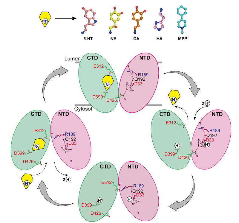 By thoroughly analyzing the mechanisms by which VMAT2 recognizes different structurally diverse monoamine neurotransmitters and neurotoxins, this work proposed a molecular model for VMAT2 conformational changes and further refined the specific mechanism of proton-coupled substrate transport.
