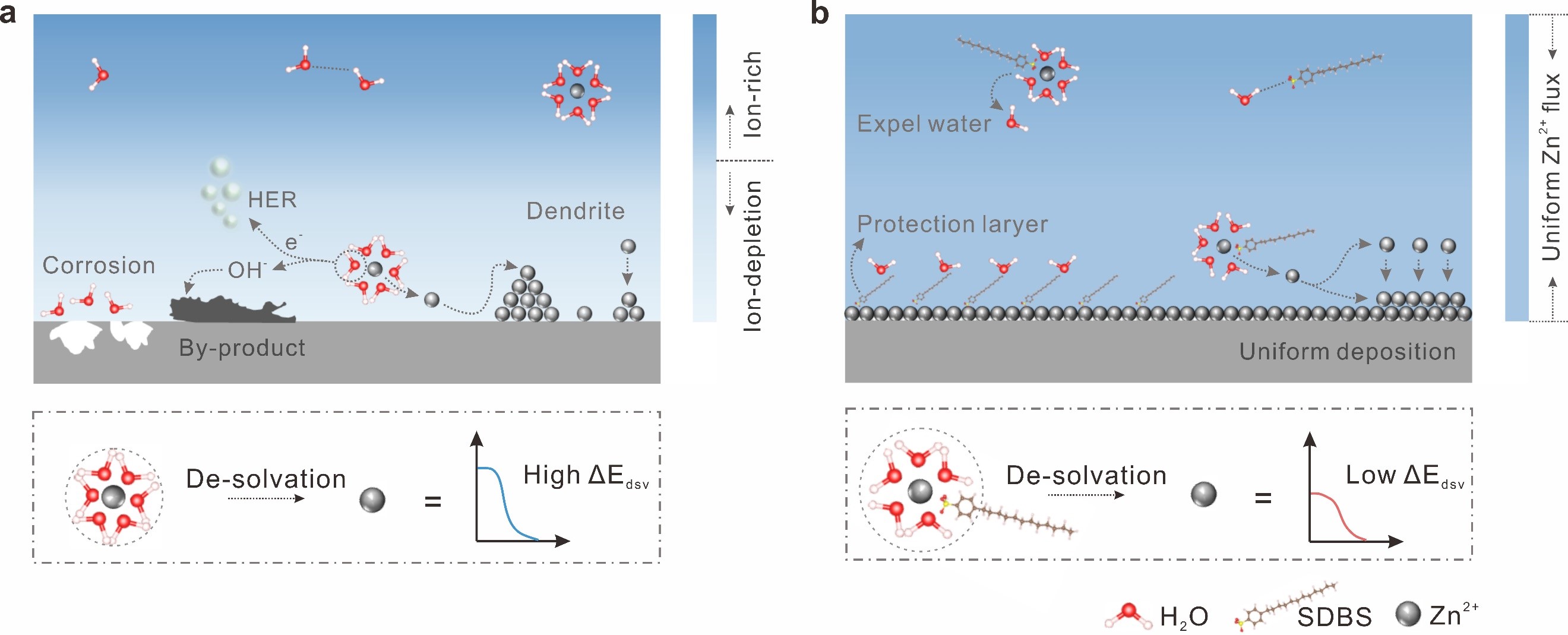 Figure 1. Schematic diagrams for Zn deposition in ZnSO4 (a) and SDBS/ZnSO4 (b) electrolytes. (Image by LI Zhaoqian)