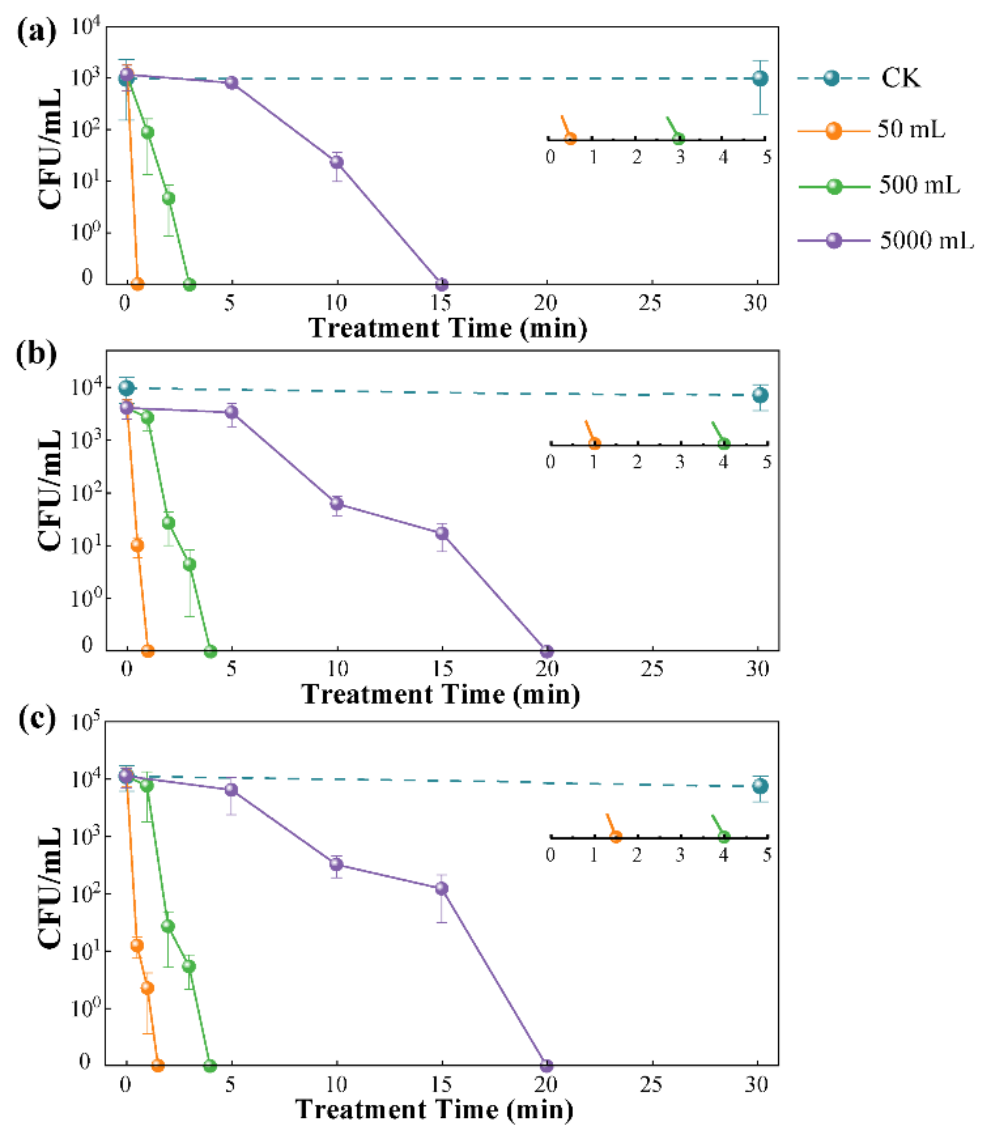 Fig.2. The inactivation effect of GADP against VP in 50 mL, 500 mL and 5000 mL of ASW, the concentrations of VP (a)1.0×103 CFU/mL; (b) 5.0×103 CFU/mL; (c) 10×103 CFU/mL. (Image by SIBET)