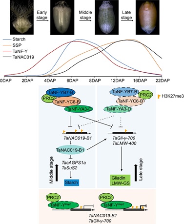 Further analysis found that the TaNF-Y trimer complex interacts with Polycomb Repressive Complexes 2 (PRC2), recruiting histone H3K27me3 modifications and inhibit the transcription of SSP-encoding genes TaLMW-400 and TaGli-γ-700, as well as a negative regulator of starch-encoding genes, TaNAC019. In this way, it directly regulates wheat SSP and indirectly regulates starch accumulation.