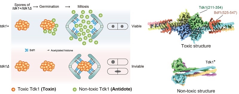 The left cartoon model illustrates how Tdk1 as both a toxin and an antidote controls mitosis of fission yeast spores. The right panel shows that the toxic and non-toxic structures of Tkd1. (Image by YE Keqiong's group)