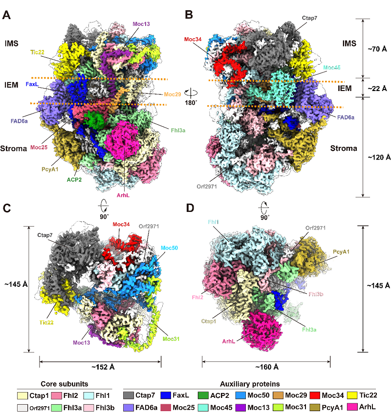 Based on this study, the researchers proposed two models for the association of these complexes, offering significant insights into the coordination between the TOC-TIC supercomplex and the motor protein complex in precursor protein translocation processes and mechanisms. This study provides important structural basis for understanding the process of the transport of precursor proteins.