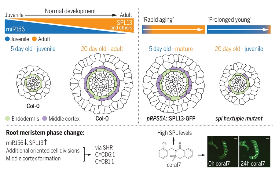 In a breakthrough study published in Science on Nov. 15, international researchers have identified mechanisms driving age-dependent morphological changes occurring in the root apical meristem during phase change.