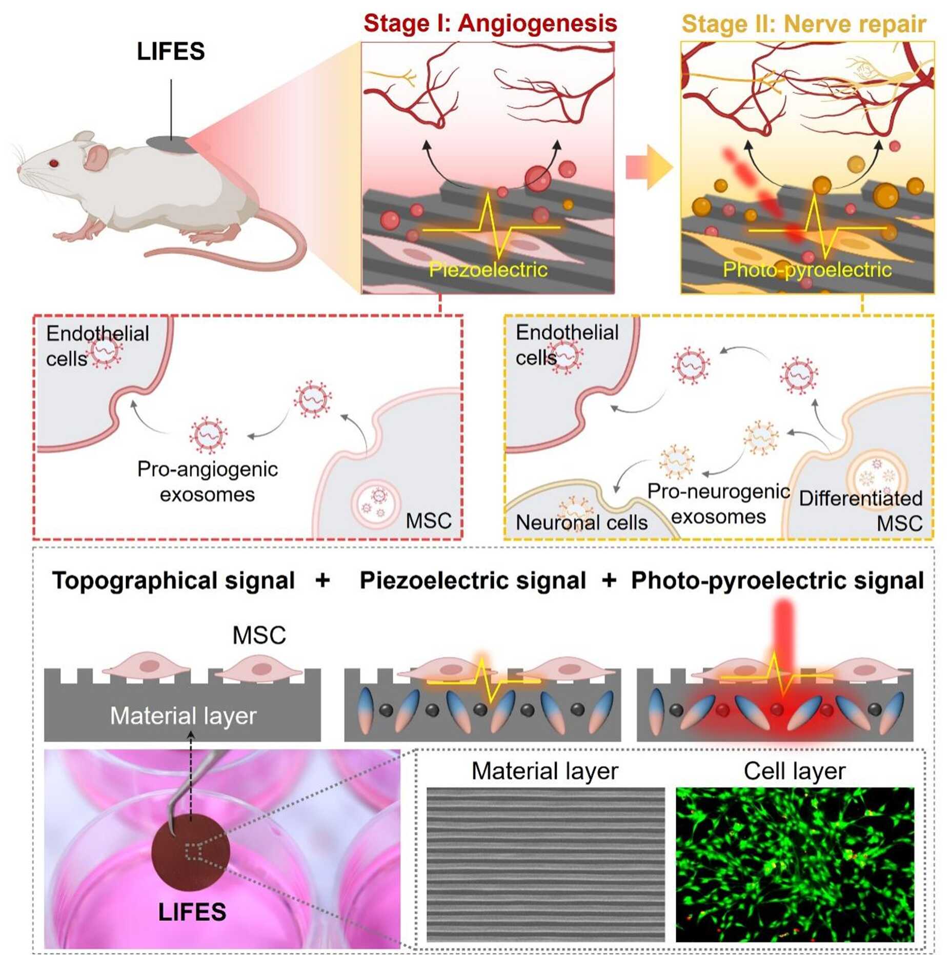 Design of the LIFES. LIFES imparts topographical, piezoelectric, and photo-pyroelectric signals for cell modulation, enabling fine-tuned exosome secretion, which facilitates neurovascular remodeling. (Image by SIAT)