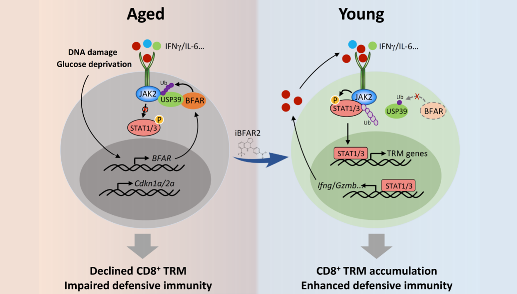 To figure out how aging causes a decrease of CD8+ TRM cells, the researchers used multifactorial gene screening and found that high expression of the E3 ubiquitin ligase BFAR inhibited the production of TRM cells among CD8+ T cells derived from elderly individuals. Mechanistically, the E3 ligase BFAR suppressed cytokine-induced JAK2 signaling by activating JAK2 deubiquitination through the deubiquitinase USP39, thereby limiting downstream STAT1-mediated TRM reprogramming.