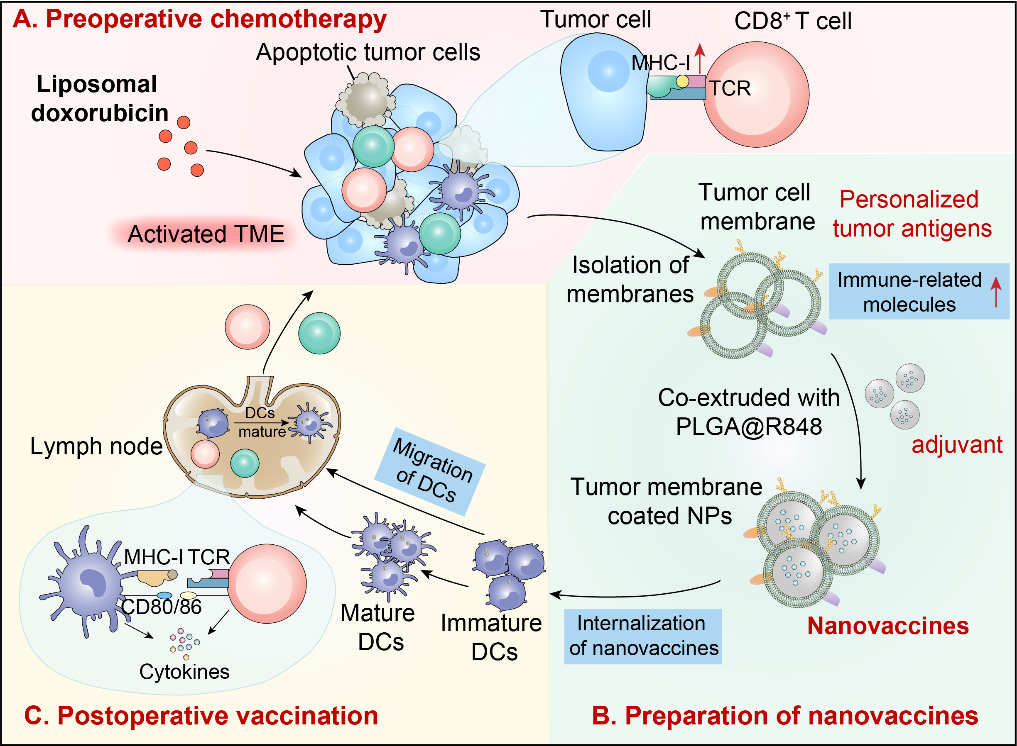 In this study, researchers investigated the effects of preoperative chemotherapy on the efficacy of TMVs employing nano-formulated liposomal doxorubicin (NP-Dox) as a preoperative medication. For the formulation of the TMVs, they obtained the tumor membrane as the antigen, and resiquimod (R848), a potent dual Toll-like receptor 7/8 agonist with excellent efficacy, was encapsulated in Poly (lactide-co-glycolic acid) (PLGA) nanoparticles to act as the adjuvant of the vaccine. The TMVs formulated from liposomal doxorubicin-treated tumors induced superior dendritic cell maturation and T cell activation compared to doxorubicin, demonstrating better efficacy in preventing recurrence and metastasis in the postoperative murine model, as well as in extending postoperative survival.