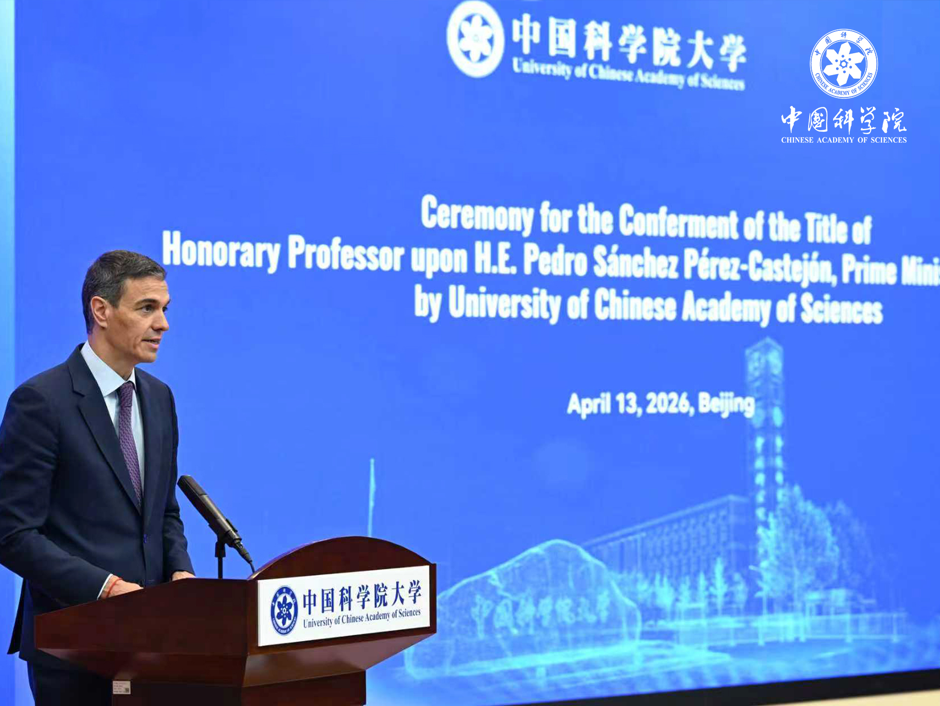Spanish PM Pedro Sánchez (C) receives honorary professorship from UCAS, April 13, 2026. (Image by CAS)